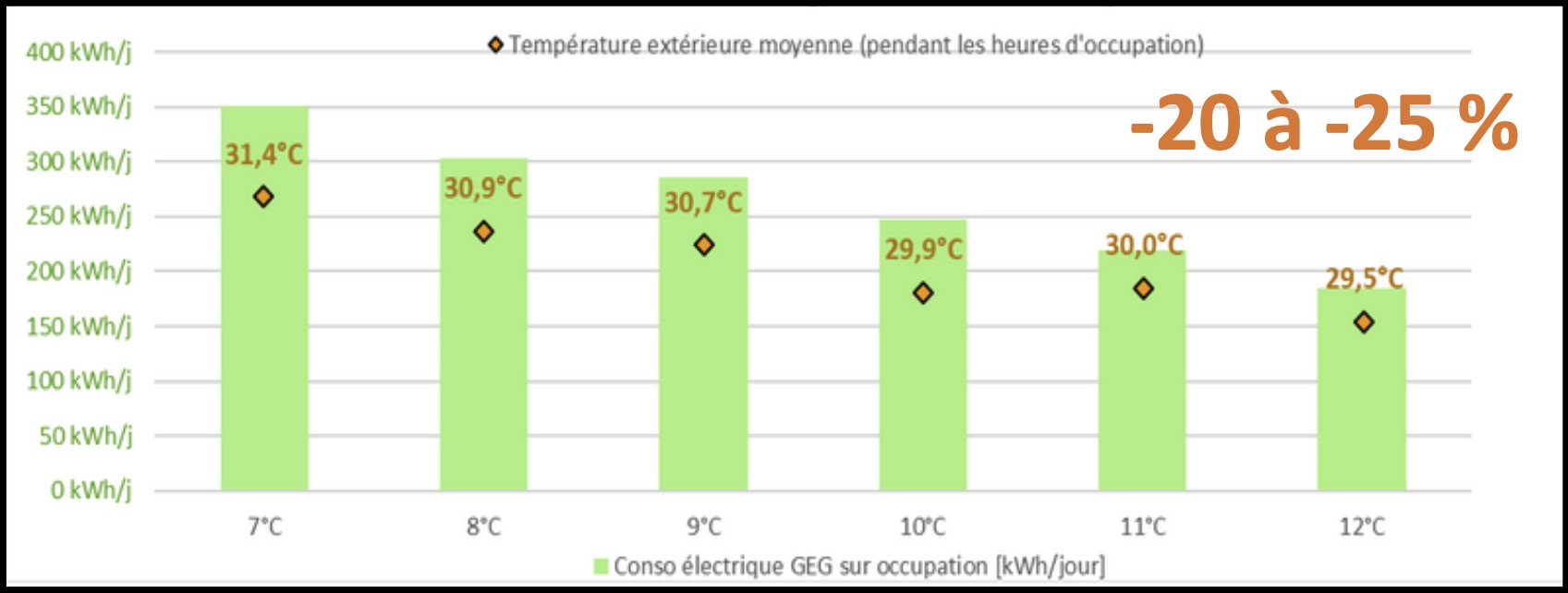 De confirmer l’importance de la conduite d’installation. En hiver et en saison intermédiaire, notamment à La Réunion, il est possible de se passer de la climatisation tout en restant en zone de confort à l’intérieur des locaux grâce à l’utilisation de brasseurs d’air. D’autre part, des gains énergétiques importants sont possibles en coupant la climatisation les week-end et les nuits, en fonction de la possibilité et de l’usage des locaux. Ces pilotages peuvent permettre plus de 50% d’économie sur le poste climatisation.